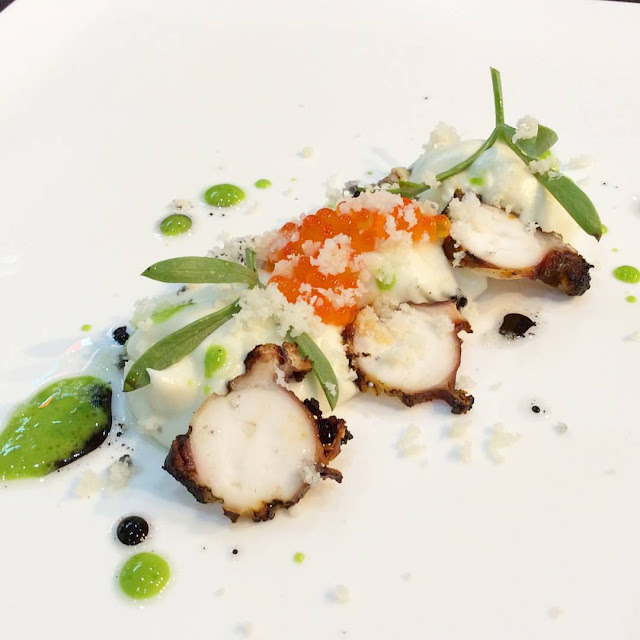 Higado de pato con alcachofas, naranja y almendra; Tartar de atún rojo con granada; Galete de atún a la basa con patatas y espárragos braseados; Rape con pulpito al horno y panceta frita