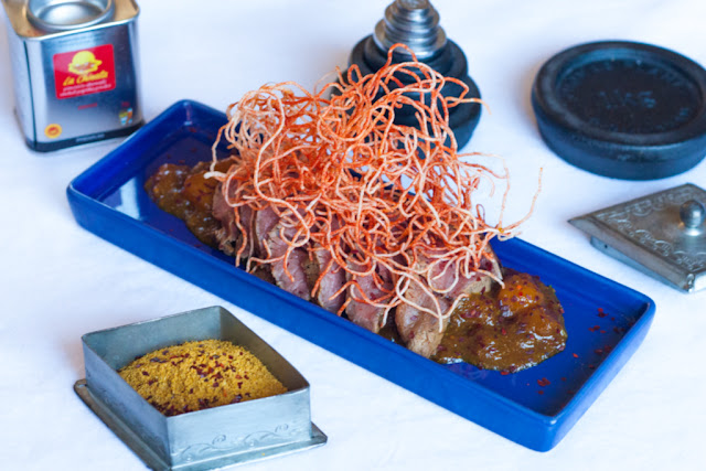 Tataki de solomillo de ternera, chutney de mango y fideos crujientes al pimentón