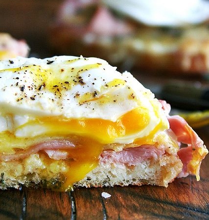 La tercera versión es el Croque Madame , un sándwich también de origen francés, de pan de molde untado con mantequilla, relleno con jamón cocido y queso gruyere, tostado y coronado con un huevo frito (cuando la yema se rompe e impregna el sándwich, es como tocar el cielo!).