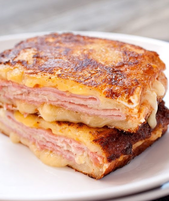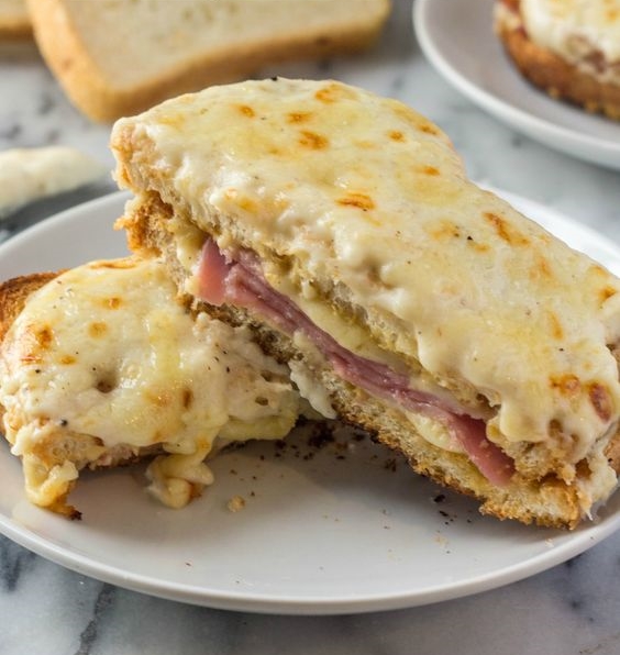 El Croque Monsieur , más contundente y con más aporte calórico, se remonta a 1910, año en el que aparece por primera vez en la carta de un café de París; entre dos rebanadas de pan de molde untadas con mantequilla, se intercalan lonchas de jamón cocido y de queso emmenthal o gruyere, y tras pasar por la plancha o tostadora, se cubre con bechamel, más queso emmenthal o gruyere rallado y se gratina hasta que el queso se dore y se funda.