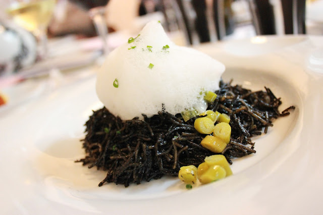 En un momento dado, bajamos a la barra del restaurante ‘Vuelve Carolina’ , colindante a ‘El Poblet’ y también propiedad de Quique Dacosta, para deleitarnos con dos champagnes de la Maison Taittinger , Prestige Rosé Brut y Réserve Brut , dos maravillas surgidas en Reims que fueron acompañadas por gustosos entrantes elaborados por el equipo de cocina de Dacosta: coca gigante de Dacsa , con mantequilla ahumada; patata suflé con centro líquido de yema ; papel & presa ibérica ; y langostinos crujientes con emulsión de tomates secos .