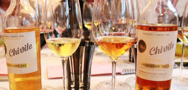 Acompañando los postres de la excelente comida que nos ofrecieron posteriormente en ‘El Poblet’, probamos dos vinos dulces elaborados con uva moscatel de grano menudo: Chivite Colección 125 Vendimia Tardía 2010 y Chivite Colección 125 Vendimia Tardía . El primero resultó intenso, complejo y potente, con puntos de fruta escarchada, acacia y sándalo, que daba muy bien en boca gracias a su intenso retrogusto y su buena acidez. El segundo, con una crianza en barrica de 9 meses, posee aromas potentes a flores y a frutas desecadas con miel de lavanda. En boca da rienda suelta a una complejidad fuera de lo común, siendo denso, con una dulzura en su punto justo y una excepcionalidad que le viene conferida por la presencia de uvas con Botrytis. Sencillamente maravilloso.