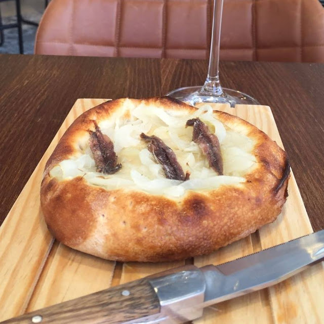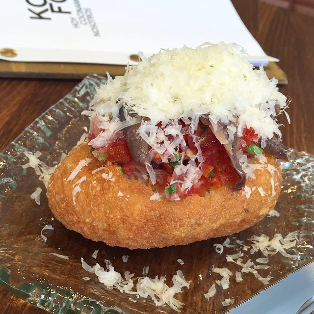| Pizza frita: tomate, anchoa, cebollino, nube de queso, cebolla morada y toque de cilantro |