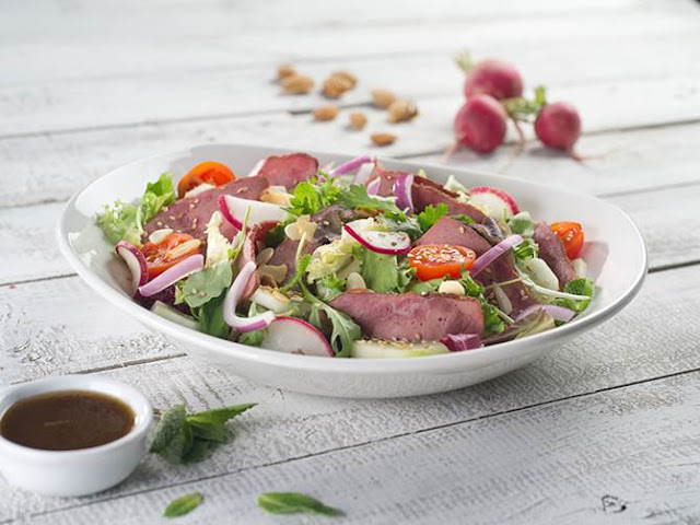 Pastrami , mezclum de lechugas, espinacas, cebollas rojas, rábanos, tomates cherry, pepino, almendras, semillas de sésamo, hierbabuena y cilantro aderezados con una vinagreta asiática . Una ensalada con personalidad propia llena de matices que no dejará a nadie indiferente.