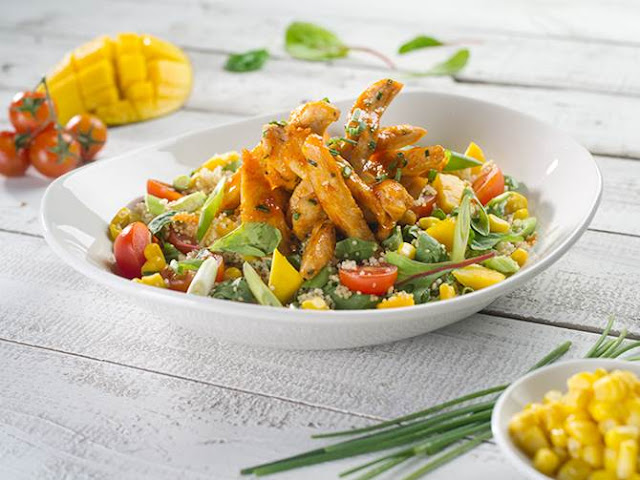 El sabor y textura de la semilla quinoa mezclado con las notas picantes de la pechuga de pollo glaseada con salsa sweet chili, tomates cherry, maíz, espinacas y mango ácido . Una explosión agridulce que se completa con una suave vinagreta de yogur que termina de armonizar el conjunto.