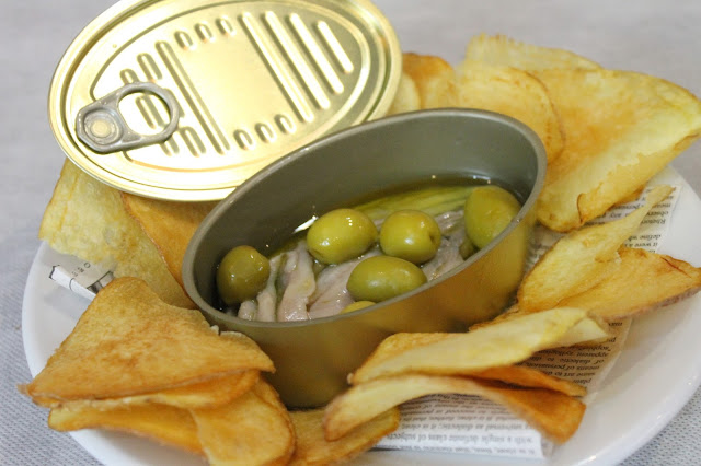 | 'Las Latas de Concha' - boquerones al vinagre de sidra y vino blanco con aceitunas y chips caseras |