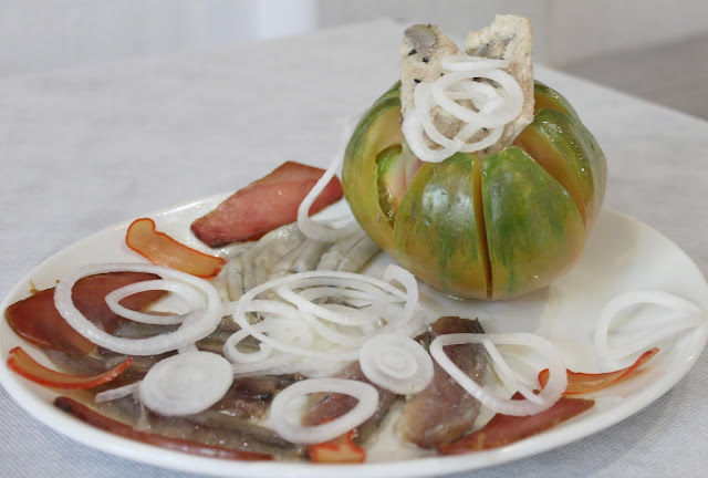 | Ensalada de tomate, cebolleta, salazones y marinados caseros |