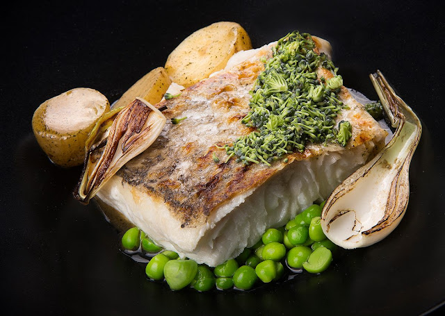 | Komfort - merluza con guisantes, cebollitas y emulsión de lima |