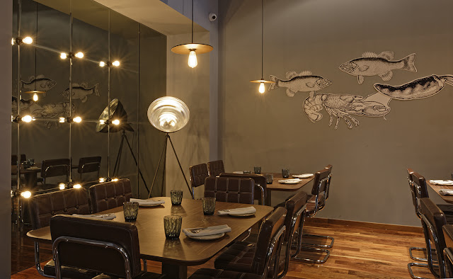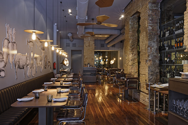 Con una decoración en la que destaca las columnas de ladrillo recuperadas de la construcción original en los bajos de los habituales edificios modernistas de la Gran Vía Marqués del Turia de Valencia, encontramos inmediatamente una cava de vinos con cerca de 100 referencias entre vinos blancos, tintos, rosados, cavas y champagnes. Suelos de madera, mesas de nogal americano, sillas en estilo post-modernista , muebles y ventiladores orgánicos diseñados ex profeso para el local, así como una iluminación cálida con un punto escénico, distinguen dos zonas: barra y comedor. El proyecto lo firma el arquitecto portugués Nuno Rodrigues y su equipo de Metrobox & Co .