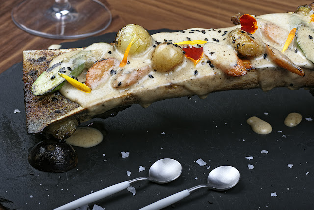 Por otra parte, me empeñé en probar su plato denominado Hueso de Mammut, un tuétano de ternera braseado con verduritas, crujiente de cebolla y espuma de tuétano , pues su presentación es una de las mejores que he visto últimamente en restauración , pero es que su sabor profundo a carne es una maravilla . Hay que comerlo ayudándose con una pequeña cucharita redondeada para poder extraer todo lo que lleva dentro. El paraíso de cualquier carnívoro que se precie de serlo.