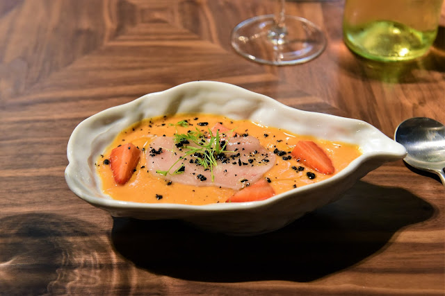 | Vinoblanco - salmorejo con fresas, sashimi de pez mantequilla y polvo de aceituna negra |