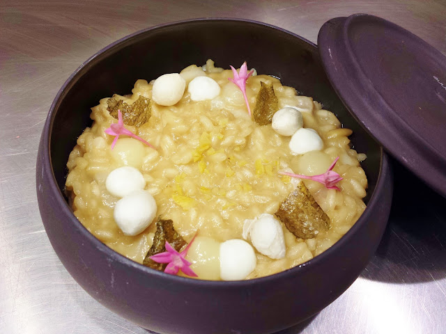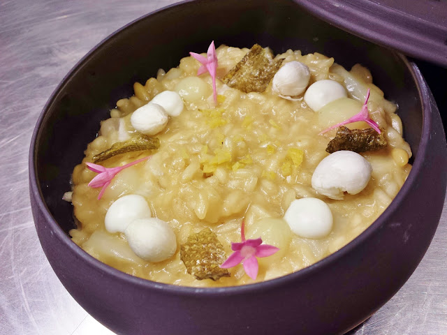 Ponemos el arroz en un plato, unos puntos de alveolo de limón, piel de bacalao frita, cebolla liofilizada, piel de limón y unas flores.