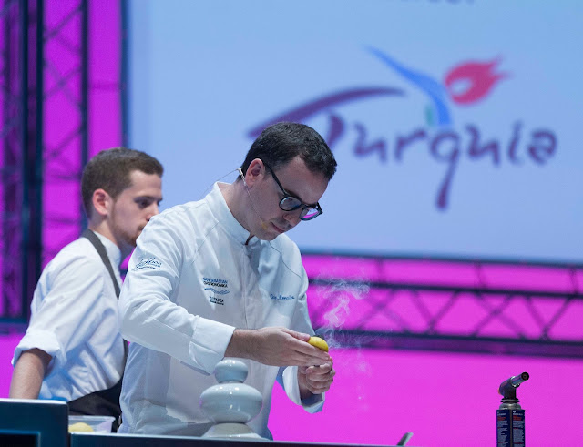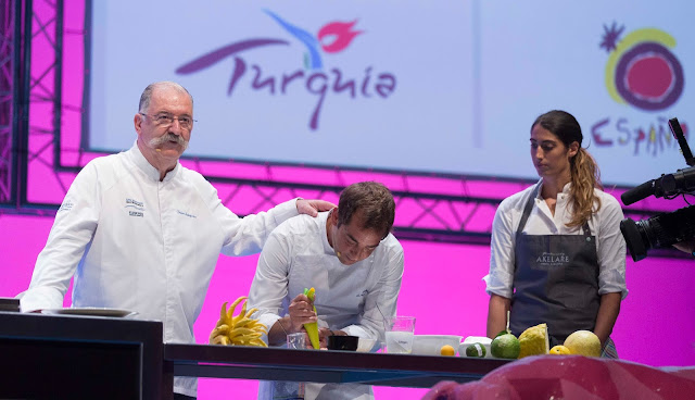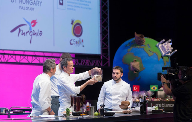 Eszter Palágyi, chef del año en Hungría , les ha cogido el relevo recordando que la gastronomía húngara es un mestizaje “ de todas las culturas que han pasado por su territorio ”, y su chef insignia, e introductor de la cocina de vanguardia y china en el país magiar, Lajos Bíró , ha divertido a los presentes con voluntad de emocionar en mesa y cocinando unas patatas con paprika en dos texturas. Por último, los pasteleros Zoltán Hamvasy Lászlo Mihályisorprenden y agradan con el tradicional dulce magiar, promocionando el trabajo con frutas, especias y hierbas locales, y valorando el arte “ como parte esencial en nuestra gastronomía ”. Producto, técnica y valorización de lo propio de seis chefs que han demostrado la paleta de gustos de su cocina.