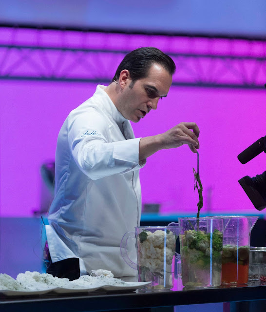 Tras el receso de mediodía, Joxe Mari Aizega y Diego Prado han presentado los últimos proyectos del BCulinaryLAB , “ un centro que quiere trabajar la innovación en conexión otros centros ”. Ambos han indicado las líneas de trabajo en las que están trabajando, entre las que destacan la de trabajo con los descartes propios del Basque Culinary Center y el queso de ortiga, extraído del cuajo vegetal de la misma planta. Paco Morales , mediante la presentación de varios platos, ha reflejado la cocina andalusí modernizada de Noor, entre ellos, ha impresionado el karim de piñones, un plato precolombino, precursor del salmorejo.