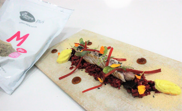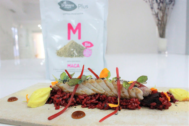 Arroz cremoso de remolacha con bonito y emulsión de ajo asado y maca