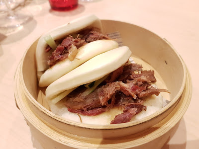 Fruto de todo esto es el menú del que pude disfrutar esta semana, una propuesta variada, fresca y divertida de finger food para comer sin cubiertos . Un menú con 12 pases salados y 3 dulces que de entre los que destaco especialmente la Berenjena ahumada con Yuca crujiente , el Cucurucho de su ya famosa Ensaladilla Rossa , las Clótxinas con su jugo granizado picante , un delicioso y sabrosísimo Bao de Pato Pekín y el original Airbaguette choco-aceite-sal .