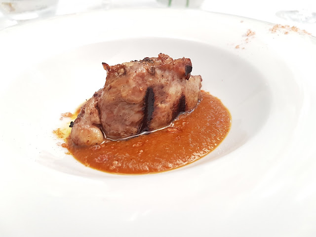 Este menú, que como el corto, carece de gluten, comienza en esta ocasión con una Croqueta 5J Romero Carvajal , melosa, con una conseguida cobertura crujiente. Un buen trabajo en el que se percibe el magnífico jamón del interior. En el exterior y debajo, una pequeña loncha de un jamón que es oro puro acompañando a la deliciosa croqueta. La Crema Fría de Gamba Blanca , es un portento de esencia de mar, gran intensidad de sabor, una delicada espuma de sifón suavizada con ligeros tropezones de tirabeque que dulcifica el conjunto. Paladar exquisito gracias a la siempre gustosa gamba blanca de San Carles de la Rápita. Le siguió la Ensalada de Boquerón Marinado, Naranja y Emulsión de aceituna , un plato brillante y conceptualmente muy conseguido en el que los sabores se funden con elegancia. Deliciosa la emulsión de aceituna junto al boquerón marinado en limón y jengibre que queda dulcificado gracias a la base de gelatina de naranja. Una opción fresca, ligera, realmente veraniega.