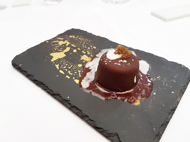 Tres postres excelentes para terminar la comida, el primero un hallazgo: Brevas, Papada, Requesón y Galleta de Aceitunas , hay que comerlo todo junto. Resulta atrevido, chocante y a la vez electrizante, pues en el paladar fluye con singularidad. Es una receta íntimamente ligada a los recuerdos familiares de Adrián. Es un plato muy mediterráneo que traslada al comensal al sur de Italia, a Grecia o Chipre. Ciertamente es uno de los postres más peculiares que he comido últimamente. El Chocolate y Crema de Leche , muy correcto, el dulce de leche en su punto justo de dulzura. Y por último, y para rematar una esplendida comida, el Bombón de Trufa , con una trufa exquisita, de calidad, que se potenciaba con la adicción de cristales de sal Maldom. Merenciano muestra sin duda alguna mucho talento a la hora de concebir los dulces que presenta en su restaurante.