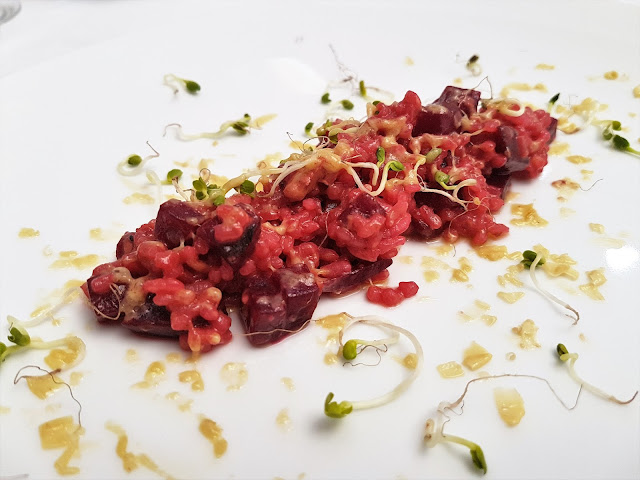 nos dejó a mí y a mi acompañante gratamente sorprendidos por su extravagancia, tal cual un risotto meloso, el foie no dominaba, la remolacha crujiente, se podía masticar, Merenciano las cuece al vacio. Es un arroz muy original, ejecutado con maestría, imagino la infinidad de pruebas realizadas hasta conseguir el punto deseado. Pura alquimia gastronómica. La