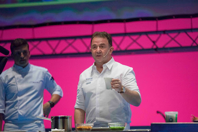 El Market ha estado lleno de profesionales durante todo el día, empresarios, chefs y amantes de la gastronomía que se han ido repartiendo por las actividades programadas por las diferentes marcas participantes. En el auditorio se han sucedido las ponencias de hasta 16 estrellas Michelin y, a mediodía, se ha celebrado la inauguración oficial del congreso donde se ha homenajeado al gran “cocinero artesano”, a Michel Bras , por ser “ el creador de una escuela única que actualmente está viva en todo el mundo ”. “ Merci, monsieur ”. El francés ha recogido el trofeo y ha demostrado principios: “ Nunca nos hemos planteado si gustar o no, sino realizarnos como cocineros ”. El aplauso ha sido general y ha tenido continuación con el pastel de celebración realizado por Paco Torreblanca, esta vez con especias y guiño indio.