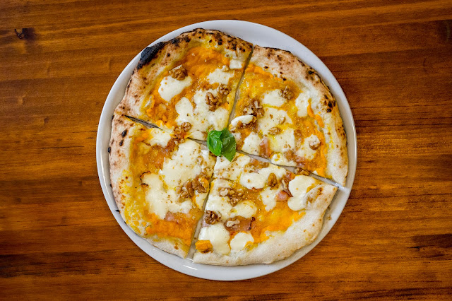 Una vez que se ha dejado fermentar lo estipulado, se hornea únicamente la base de la pizza con los ingredientes base (tomate, mozzarella, crema de calabaza, etc) para, nada más salir del horno, añadir los ingredientes de cada receta (la mayoría de ellos de procedencia italiana), consiguiendo así una potenciación del sabor del producto final. Fratelli Figurato se presenta con una carta de 12 pizzas , divididas en tres categorías: Tradicionales (Margherita, Capricciosa, Diávola), Frescas (enfocadas a un público que busca un producto más healthy y fresco) y No convencionales . En este último capítulo se incluyen las recetas propias ideadas por Riccardo, convertido ya en chef pizzaiolo de la casa, entre las que destacan la Rock&Roll , que está elaborada con mozzarella, lonchas de panceta, aceite de pesto y pimienta negra; Calabaza y panceta , con crema de calabaza asada, provola, panceta crujiente y trocitos de nueces; o Mortadella y pistachos , con crema de ricotta y pesto, lonchas finas de mortadella de Bologna y trocitos de pistachos tostados. Una oferta que se amplia gracias a las combinaciones que ofrecen los distintos tipos de masa, que multiplican por tres su propuesta.