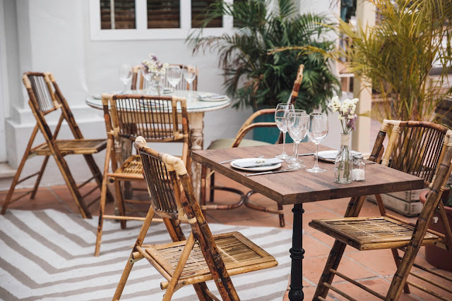 La parte exterior de más de 300 m2, se divide en diferentes ambientes para todo tipo de gustos; zona chill out con puffs y sofás bajos para el momento relax, mesas corridas al sol para disfrutar del buen tiempo y barra de copas y DJ para las noches , entre otros. Todo un mix con un estilo muy fresco rodeado de vegetación que hace que se te olvide donde estás.