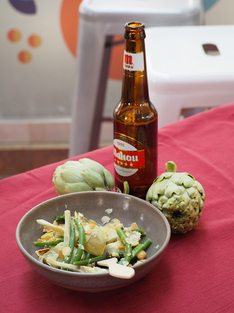 En Suc de lluna han apostado por una mezcla entre huerta y bosque, con una receta de mitades de alcachofas tiernas bio, con crema de boniato y crujientes de castañas de bosque y jamón . En Pantalán 5 las alcachofas se servirán rellenas de panceta confitada, con un rico toque de queso parmesano , una receta de contrastes. Y para acompañar una cerveza de una forma diferente, en Las Cervezas del Mercado tendrán corazones de alcachofa con crujiente de boniato y salsa dip de yogur al curry de Madrás .