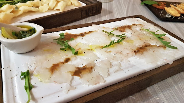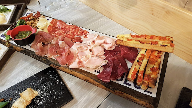 , una gran y completa tabla con sticks de focaccia casera hecha con aceite de oliva, salsa pesto, bresaola, pepperoni, speck, porchetta, tomate reposado, mezclum de lechugas, nueces y pellizcos de Grana Padano. Todo un festival de sabores para empezar a comer.