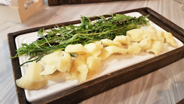 , con pellizcos de queso Grana Padano, rúcola y reducción de vinagre de Módena y miel; la