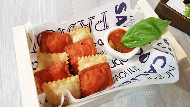 , una cesta de raviolis de queso bicolor con salsa basilicata picante; la