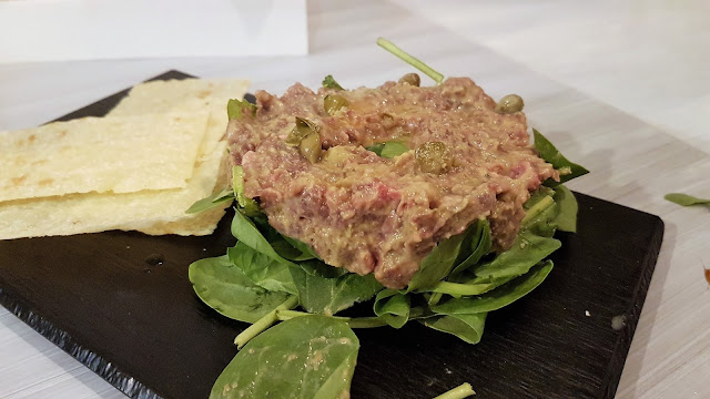 , elaborado con lomo bajo con una maduración superior a los 45 días con un picado uniforme, aliñado a la manera tradicional con alcaparras, mostaza, yema de huevo y un punto picante, servido sobre una cama de espinaca baby y pan de Cerdeña. Un plato sencillo y muy elegante, que seducirá a los amantes de la carne.