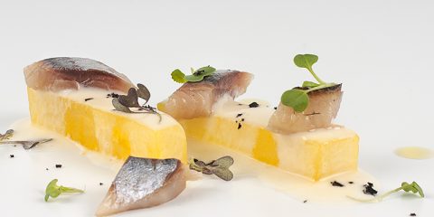 Crujiente de alcachofa relleno de blanquet y miel de naranja