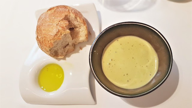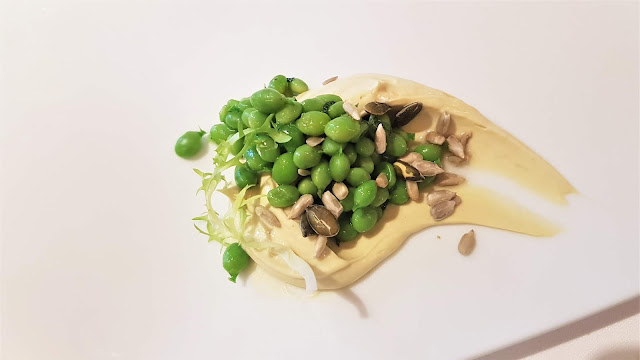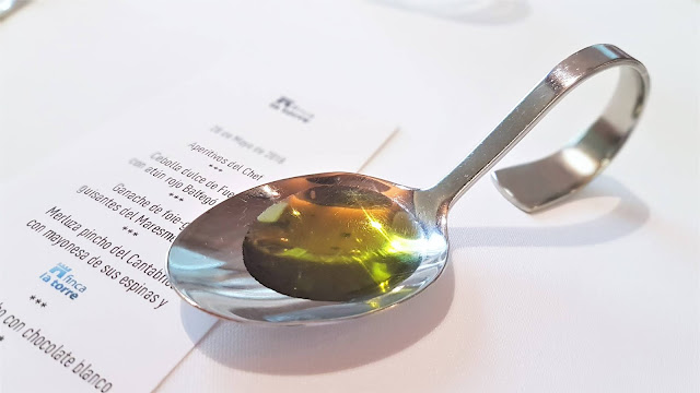 , que nos ofreció: Aperitivos del Chef, Cebolla dulce de Fuentes con atún rojo Balfegó y ponzu, Ganache de foie-gras, guisantes del Maresme y pipas, Merluza pincho del Cantábrico con mayonesa de sus espinas y Finca La Torre y Sobao de pistacho con chocolate blanco y Petit Fours.