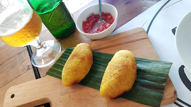, un plato colombiano de calle, popular, pero elaborado con mucho esmero, una masa casera rellena de un guiso de carrilleras con yuca, y acompañados de un refrescante pico de gallo , y el