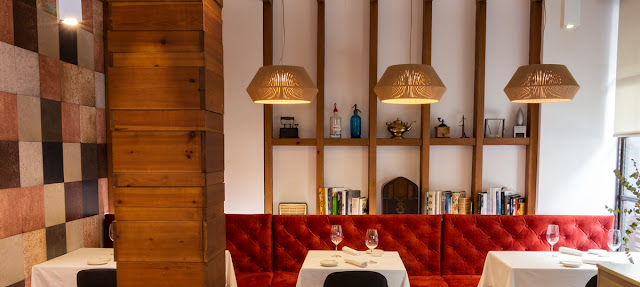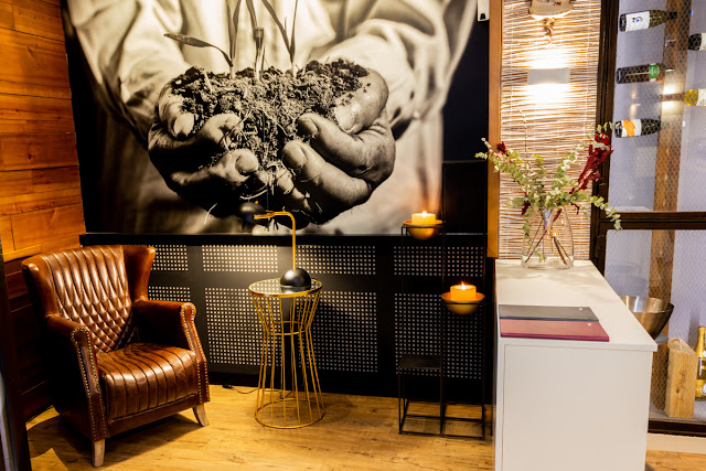 , gracias al revestimiento de la pared en tonos ocres o a la tapicería de terciopelo de los sofás, que hacen sentir al cliente en un espacio cálido y acogedor. También se ha reducido el número de mesas, de diez a siete, para ganar en amplitud y primar la comodidad. Por su parte, el vestíbulo incorpora un revestimiento metalizado y mantiene la fotografía de Mikel Ponce, que habla de huerta, de producto, de raíces.